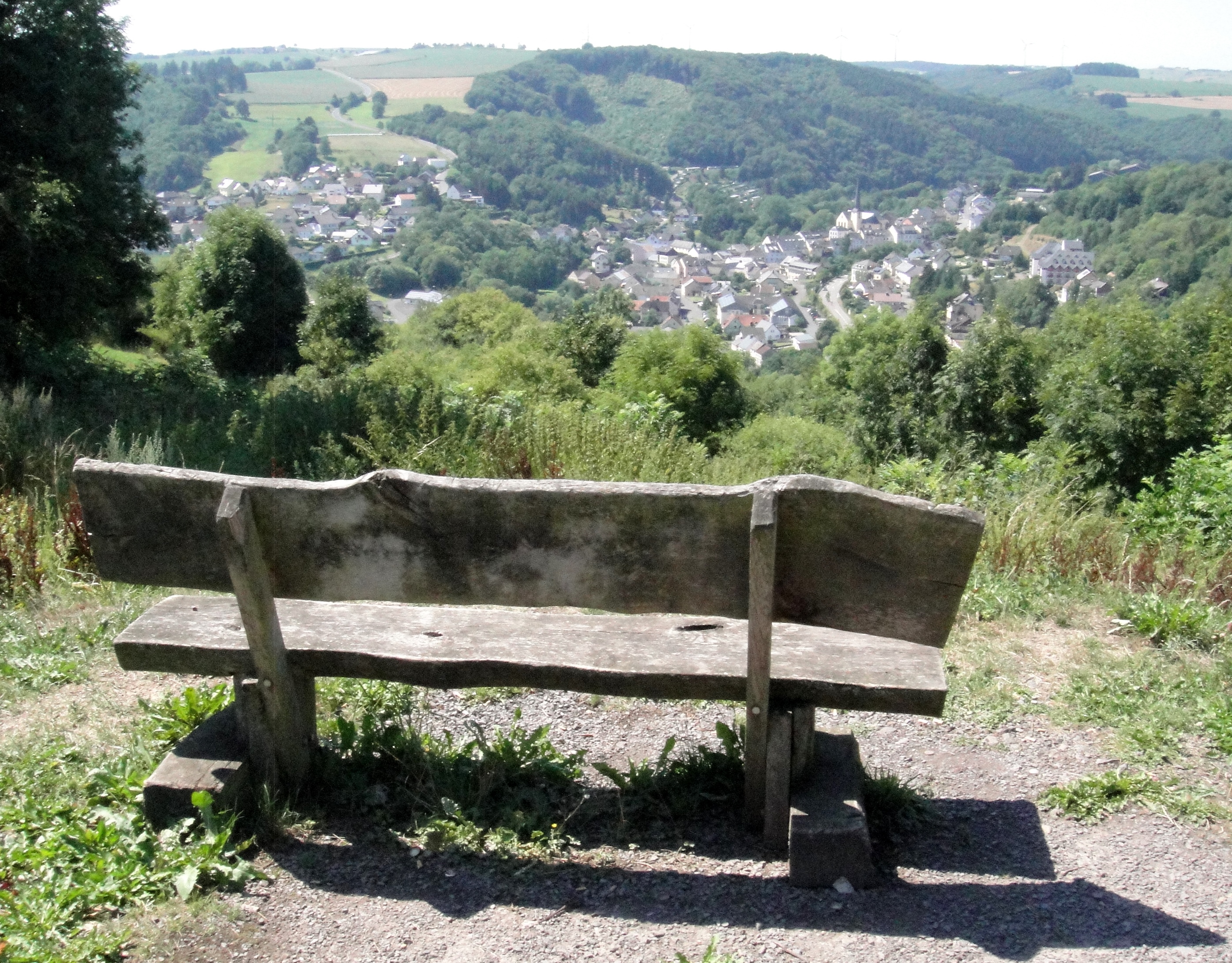 Die Prümtalgemeinde ist entstanden aus keltisch-römischen Siedlungen. Der Sage nach soll sogar der heilige Willibrord um das Jahr 728 in Waxweiler gepredigt haben. Die landschaftlich reizvolle Umgebung ist durch zahlreiche Wanderpfade mit Ruhebänken erschlossen. Wanderungen in die unberührten Täler der Prüm und seiner waldreichen Nebenbäche vermitteln eine Fülle von Naturschönheiten. Waxweiler wird als „Tor zum romantischen Prümtal“ bezeichnet. In seiner Ortschronik schrieb Heimatforscher und Ehrenbürger Edmund Endres, dass der Ort deshalb in das Gebiet des Naturparks Südeifel, der 1958 gegründet wurde, einbezogen wurde. Er ist der älteste Naturpark in Rheinland-Pfalz, der zweitälteste von Deutschland und der deutsche Teil des Deutsch-Luxemburgischen Naturparks. Unser Foto wurde auf dem Wanderparkplatz „Dinert“ nahe dem gleichnamigen Hochplateau (470 m NN) aufgenommen. Der Platz ist neben dem Gelände um die Mariensäule einer der Schönsten der Region mit Panoramablick über Waxweiler und seine Höhen.